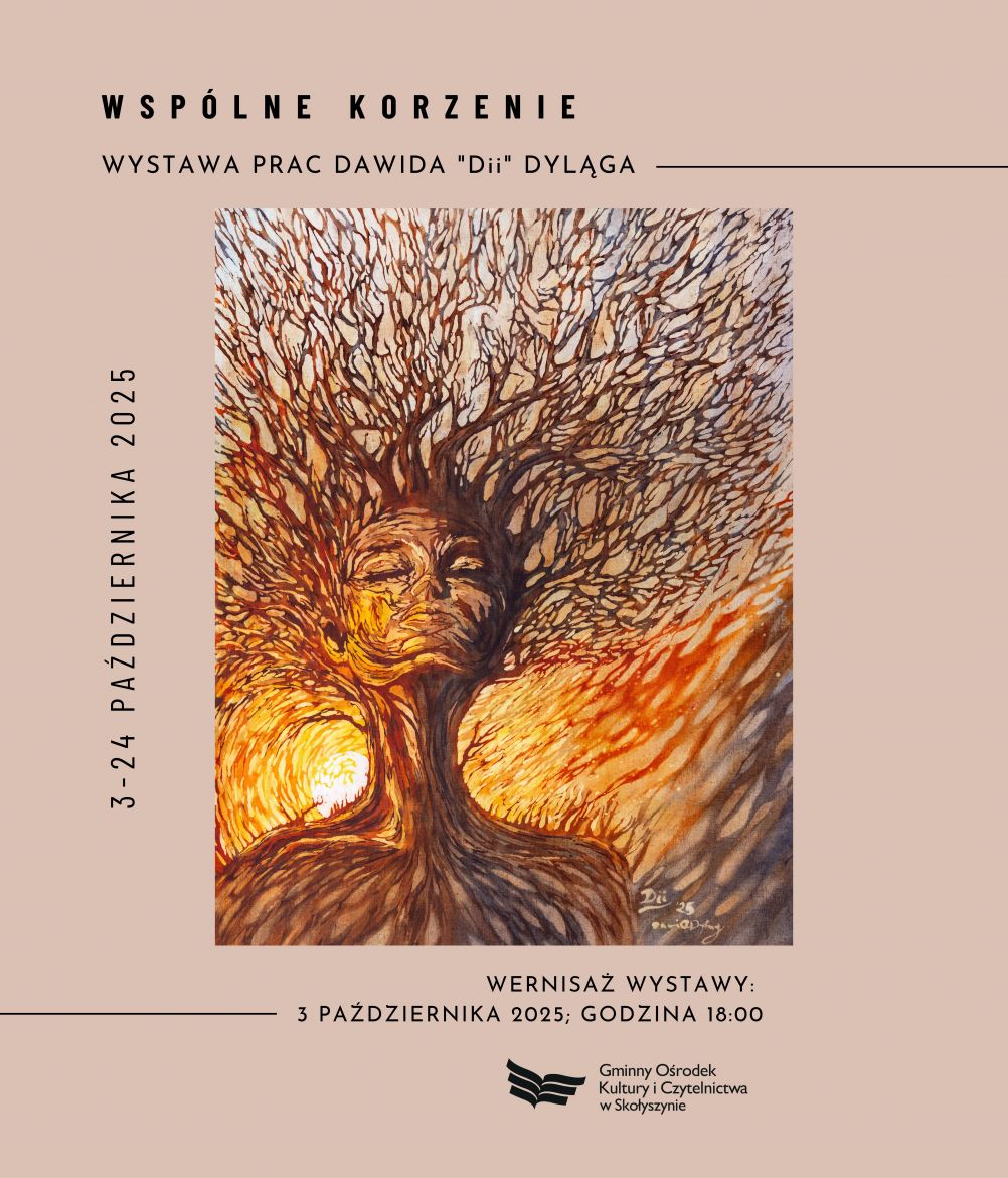 Gminny Ośrodek Kultury i Czytelnictwa w Skołyszynie zaprasza na wernisaż wystawy ”Wspólne korzenie” Dawida „Dii” Dyląga, w dniu 3 października 2025 r. o godz. 18:00.
